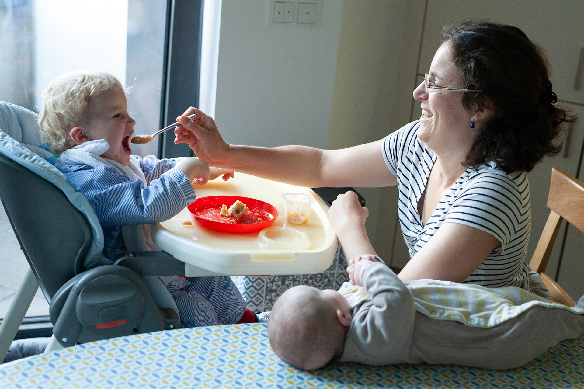 Augustin, Baptiste, et Elise, déjeunent sur une petite table. C'était beaucoup d'organisation de la part des parents.