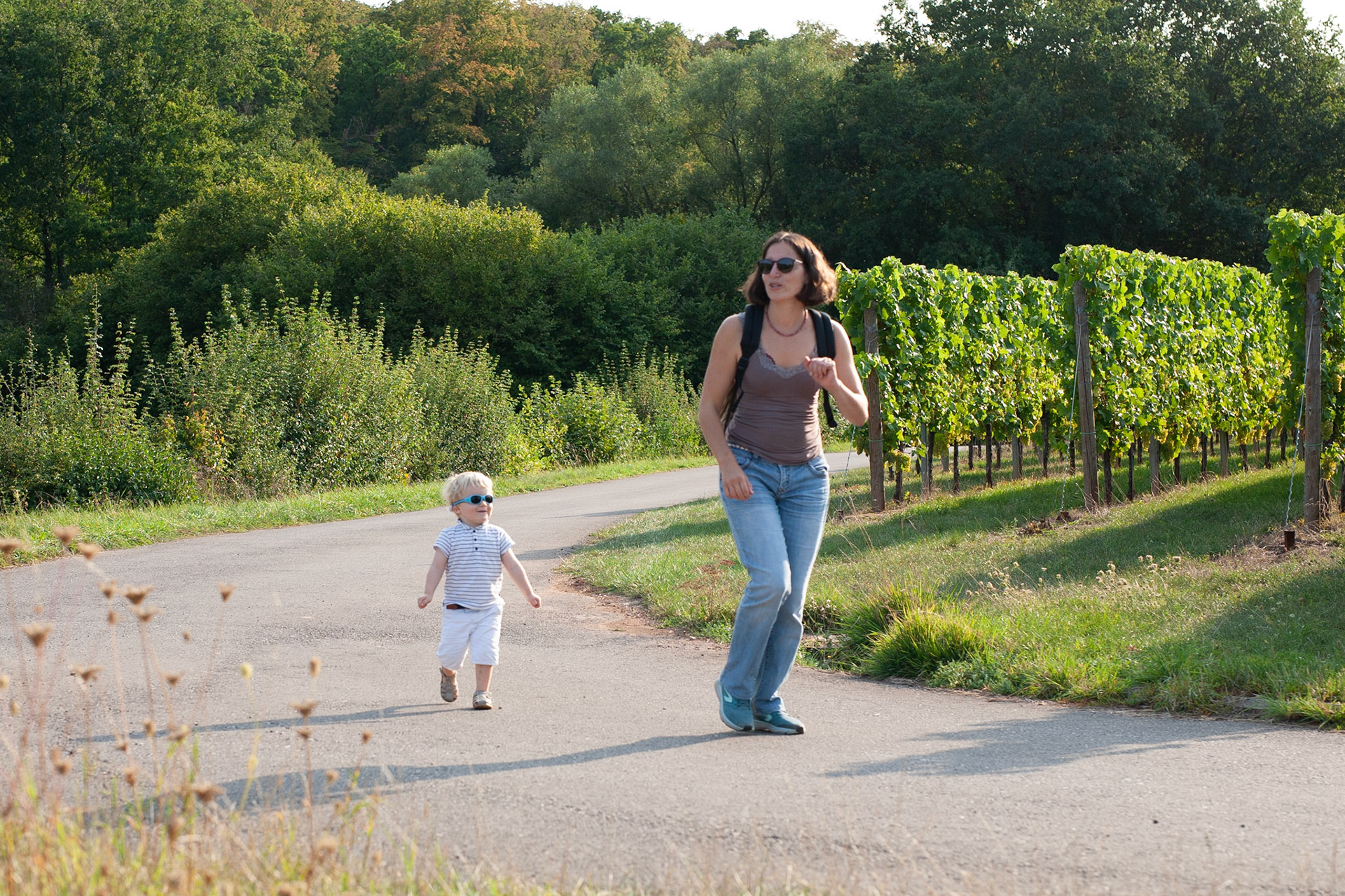 Augustin trotinne et se débrouille. Promenade de printemps derrière Belval. Il y a une piste cyclable agréable qui serpente dans les pâturages.